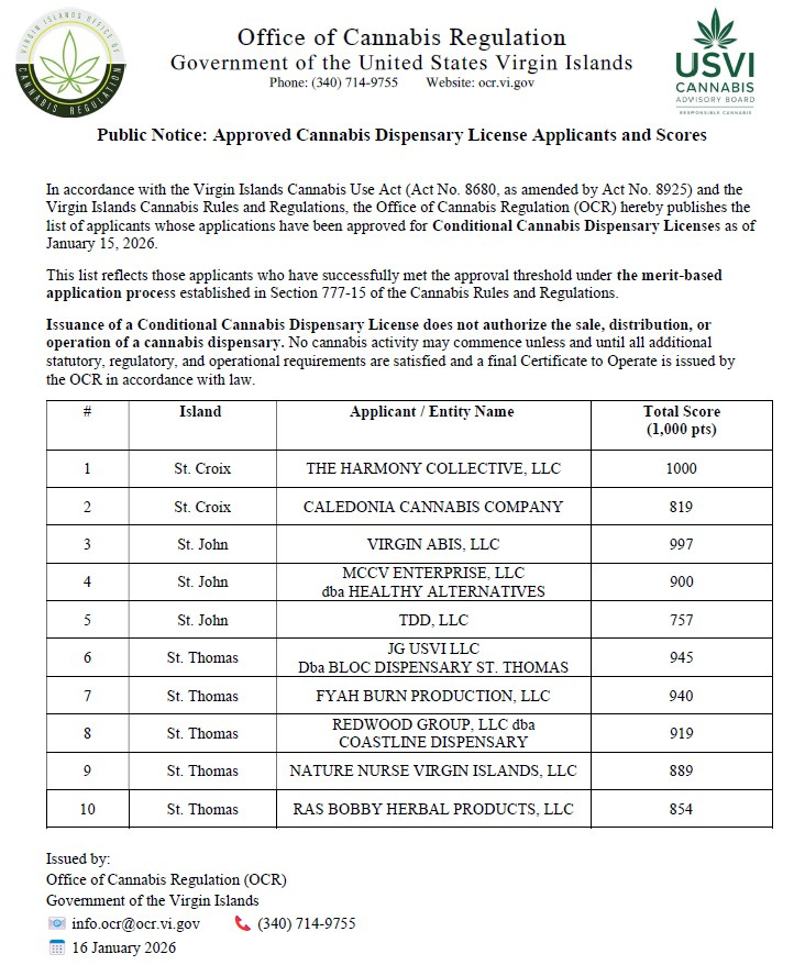 The Office of Cannabis Regulation announces the list of applicants who have been approved for Conditional Cannabis Dispensary Licenses as of January 15, 2026.